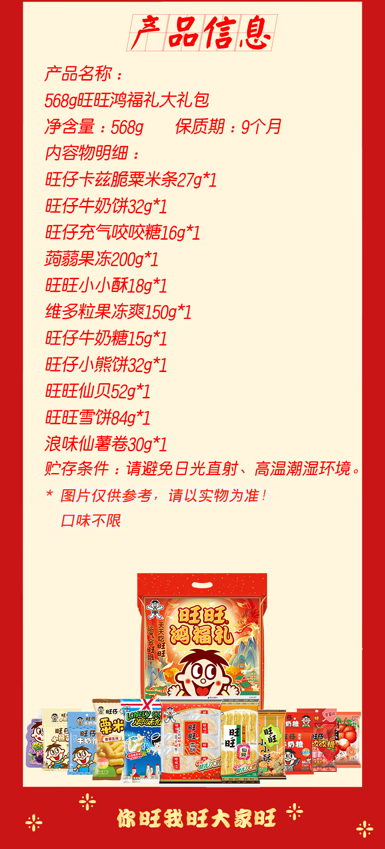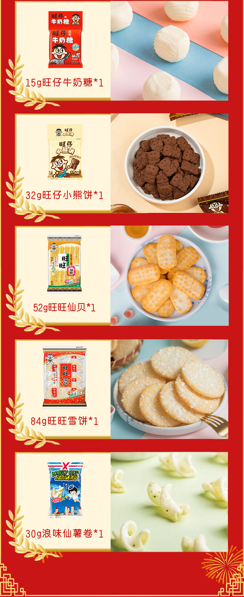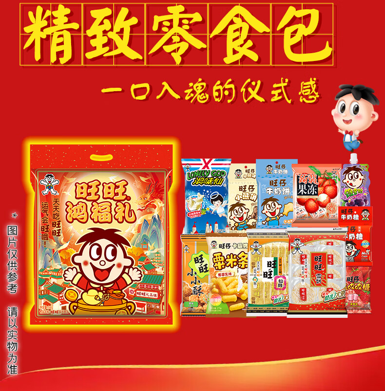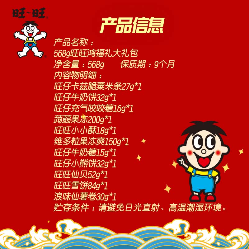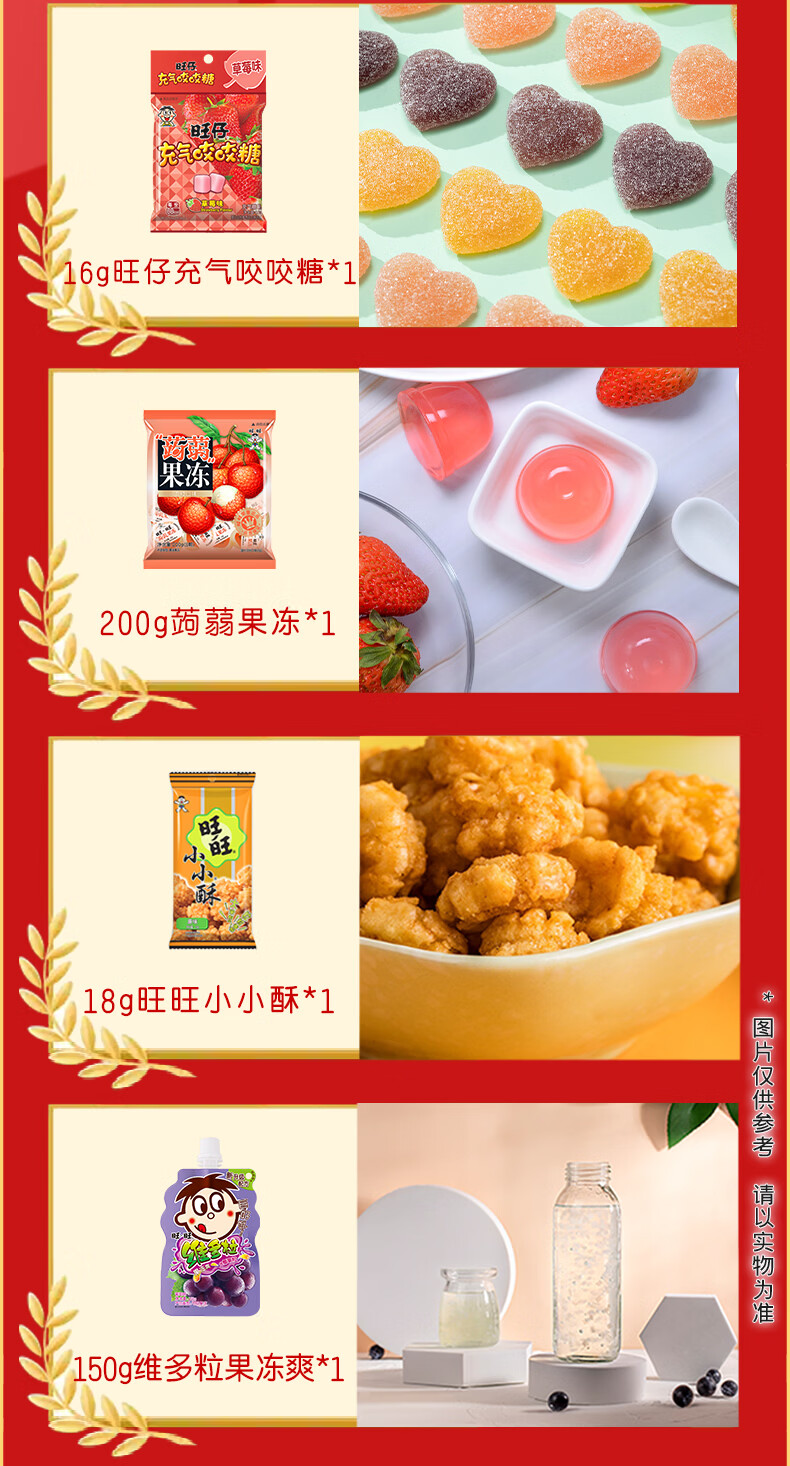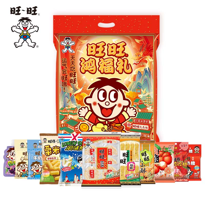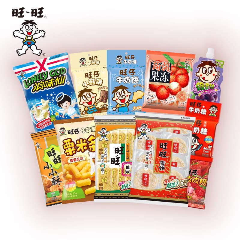 ​旺旺仙贝52g*1+ 旺旺雪饼84g*1+ 旺旺粟米条(椰蓉乳味)27g*1+ 浪味仙(田园蔬菜味)30g*1+ 旺旺小小酥(原味)18g*1+ 旺仔小熊饼(巧克力味)32g*1+ 旺仔牛奶饼(牛奶味)32g*1+ 旺仔牛奶糖15g*1+ 旺仔充气咬咬糖(水蜜桃味)16g*1+ 蒟蒻果冻(8颗荔枝口味)200g*1+ 维多粒果冻爽(冰糖雪梨味)150g*1
